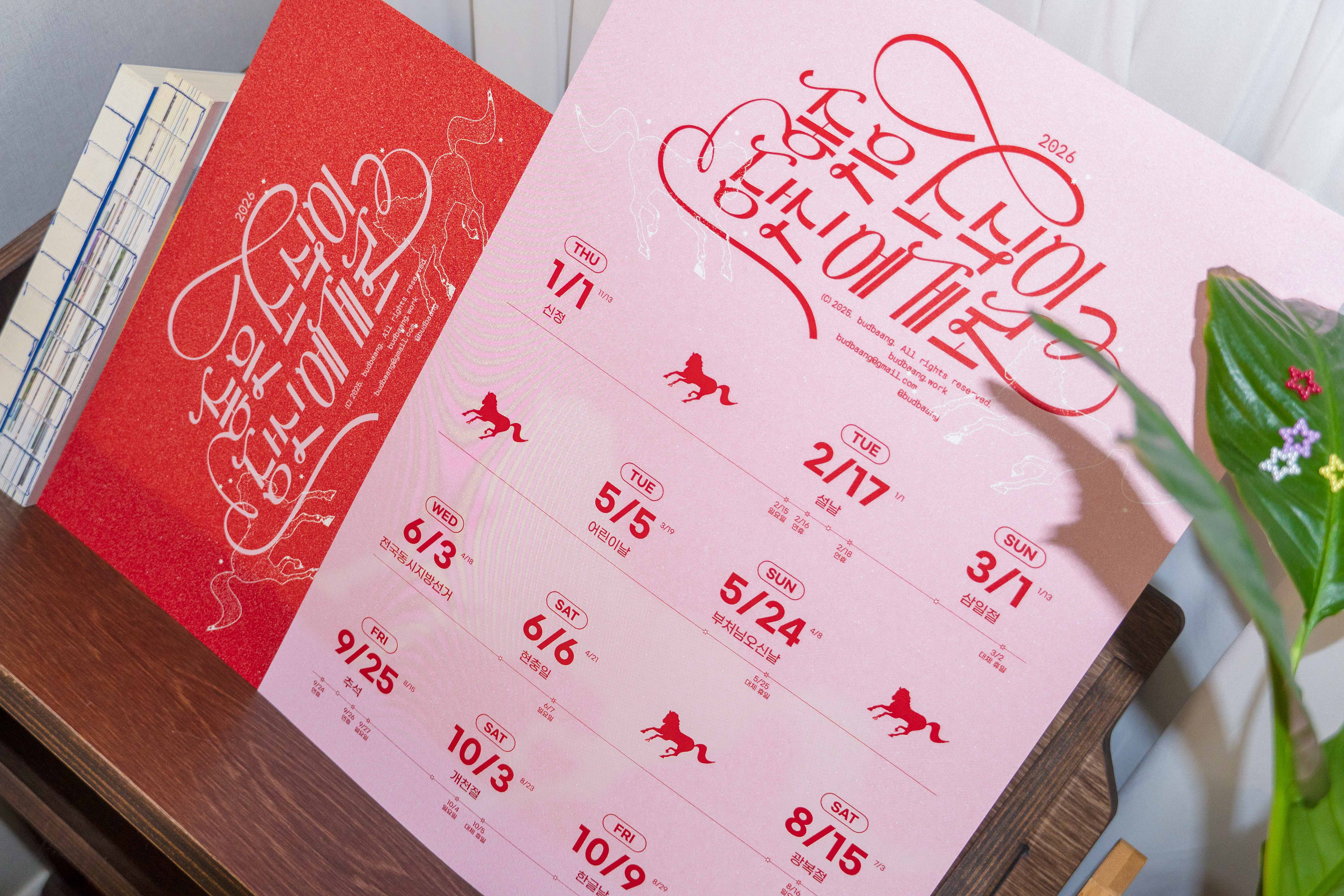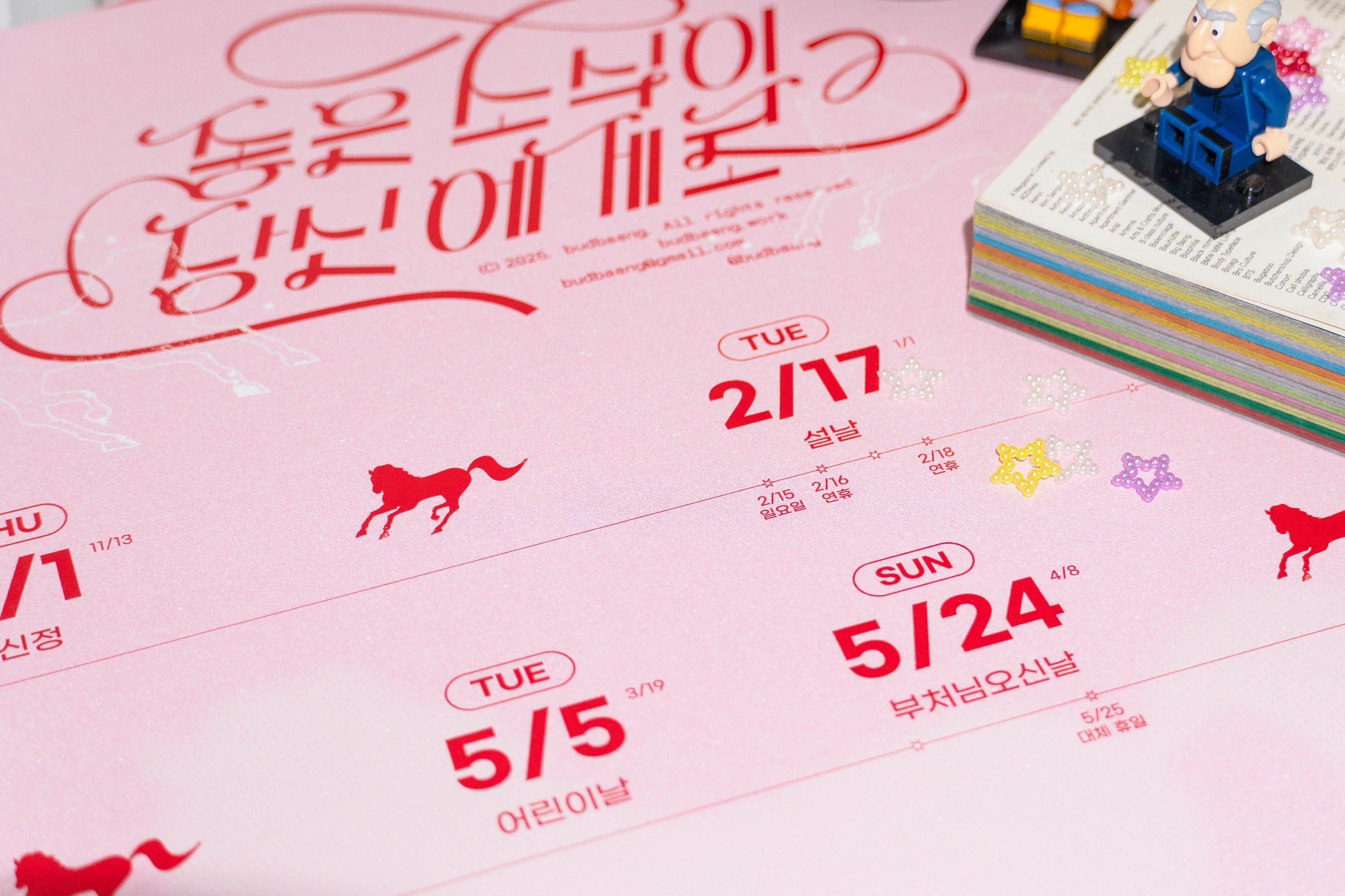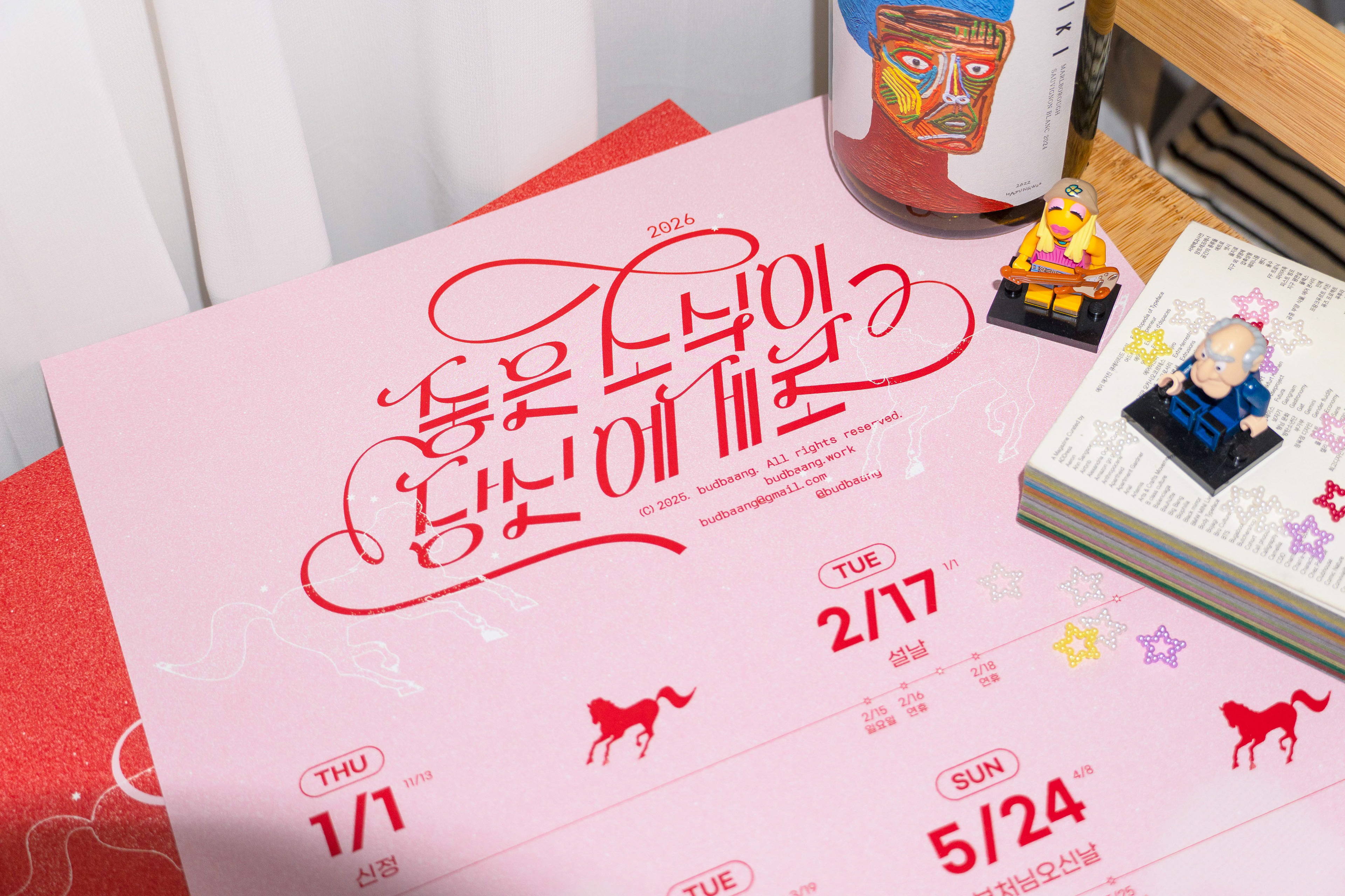 다가오는 2026년 붉은 말의 해를 맞아 달력과 연하장을 디자인했습니다. 이번 기획 달력은 종이 한 장에 법정 공휴일로만 꽉 채운 '빨간날 달력'으로, 공휴일을 포함한 연휴, 대체 휴일, 주말을 간략하게 표기했습니다. 저 멀리 힘차게 달려오는 말처럼, 한 해의 큰 흐름 속에서 좋은 소식이 한아름 가득 다가오길 기원합니다!