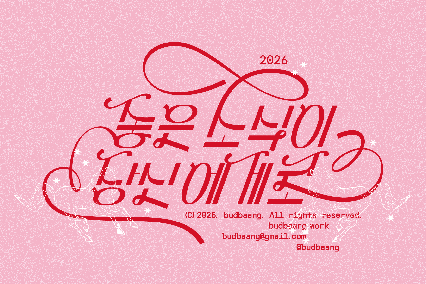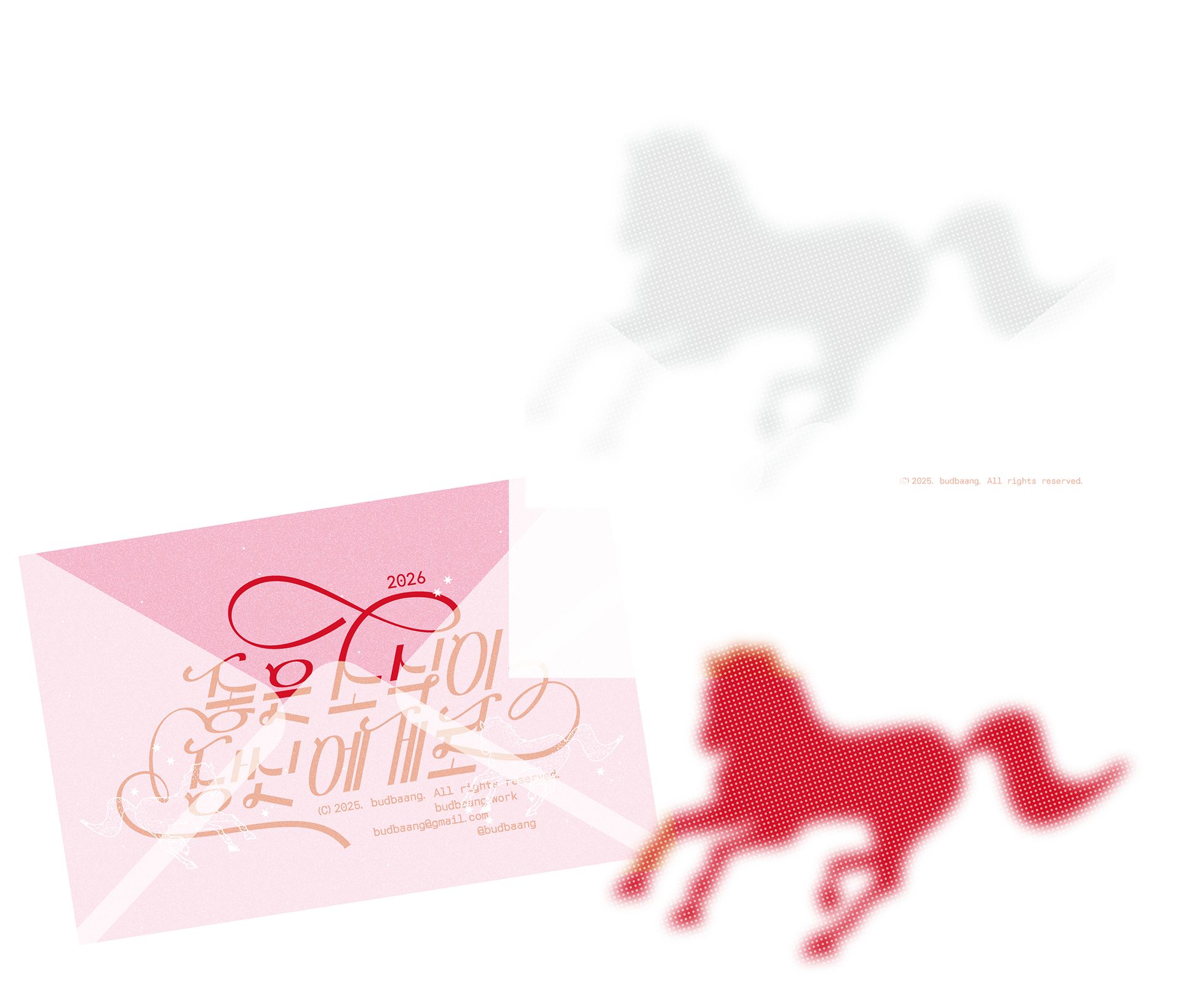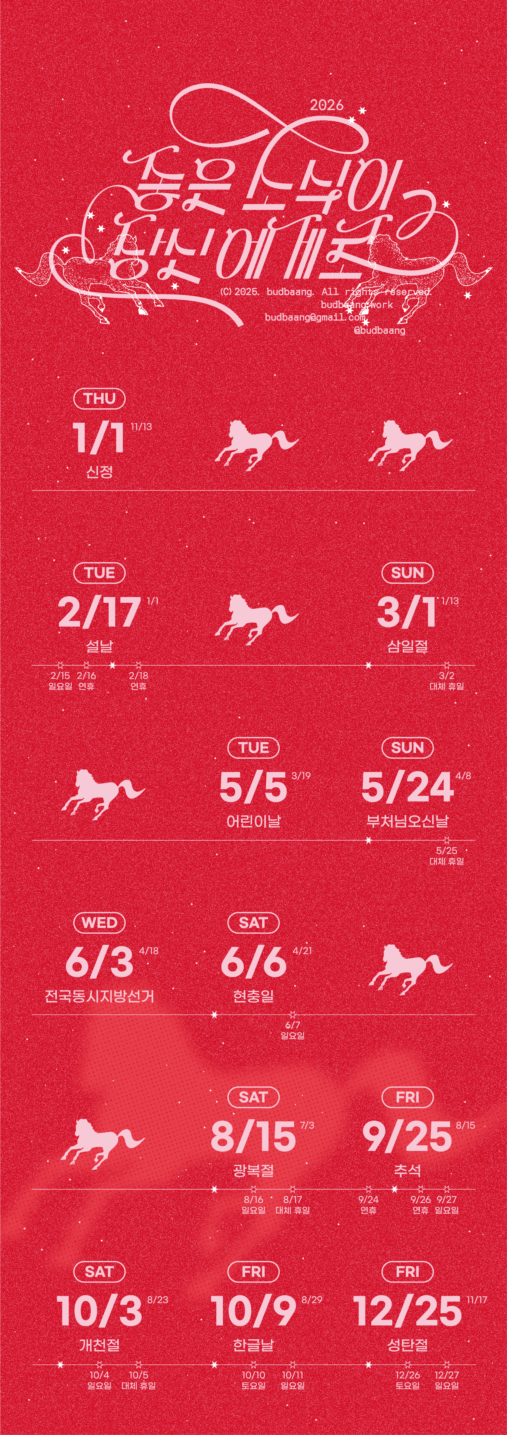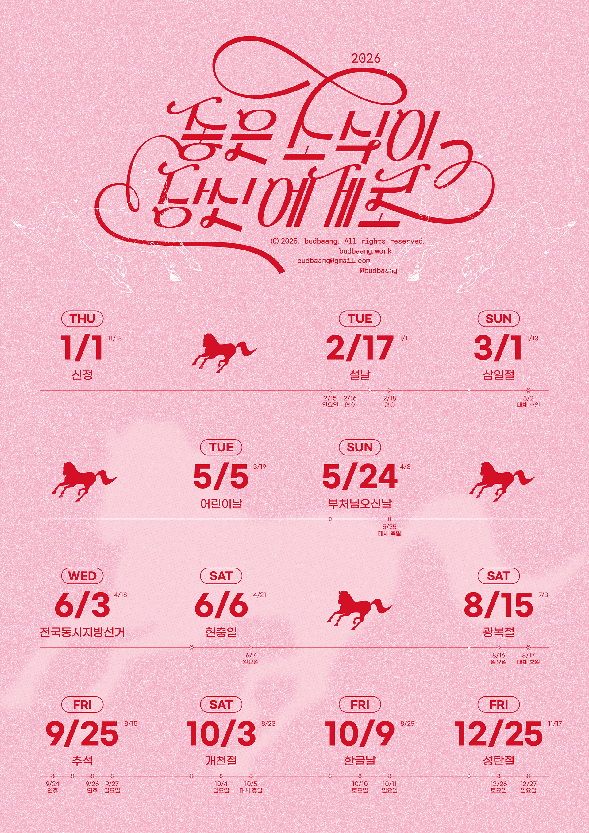 다가오는 2026년 붉은 말의 해를 맞아 달력과 연하장을 디자인했습니다. 이번 기획 달력은 종이 한 장에 법정 공휴일로만 꽉 채운 '빨간날 달력'으로, 공휴일을 포함한 연휴, 대체 휴일, 주말을 간략하게 표기했습니다. 저 멀리 힘차게 달려오는 말처럼, 한 해의 큰 흐름 속에서 좋은 소식이 한아름 가득 다가오길 기원합니다!