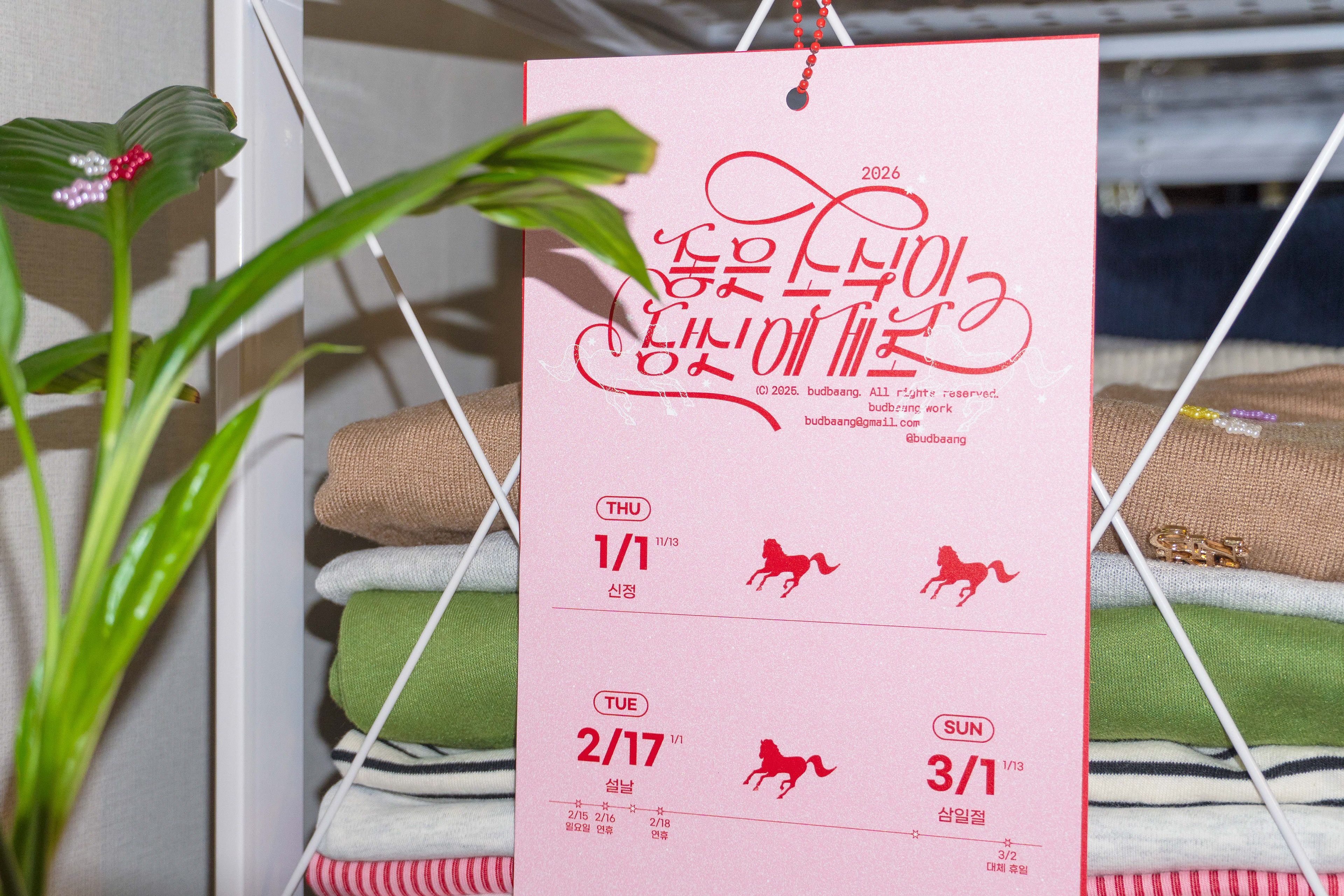 To welcome the Year of the Red Horse in 2026, we designed a calendar and New Year’s cards. This special calendar fits Korea’s official public holidays—the “red days”—onto a single sheet of paper, with long weekends, substitute holidays, and weekends clearly marked. Like a horse galloping powerfully toward us from afar, we hope that, within the greater flow of the year, an abundance of good news will come your way.